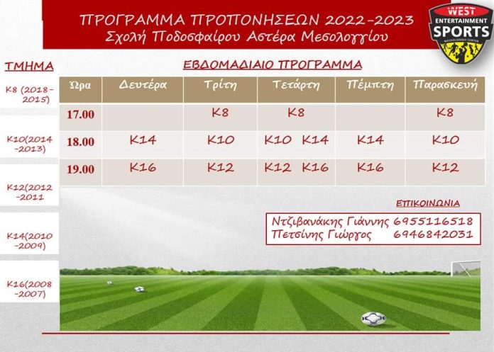 Συνεχίζονται οι εγγραφές των παιδιών στην Ακαδημία Αστέρα Μεσολογγίου, που ξεκινήσαν από τη Δευτέρα 29 Αυγούστου 2022,στις εγκαταστάσεις του West Sports Center (όπισθεν του Ραδιοφωνικού Σταθμού Μεσολογγίου), καθώς ξεκίνησαν ήδη οι προπονήσεις και οι μικροί μας ποδοσφαιριστές επανήλθαν στη δράση.