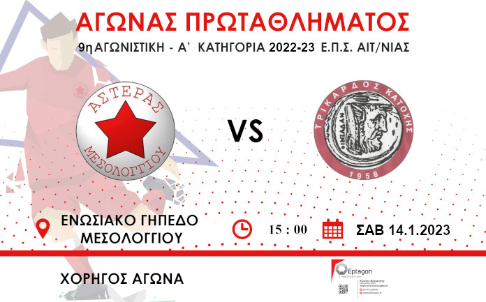Φινάλε του Α’ γύρου του πρωταθλήματος της Α’ κατηγορίας της Ε.Π.Σ. Αιτωλοακαρνανίας διεξάγεται αύριο Σάββατο 14 Ιανουαρίου 2023, με τον Αστέρα Μεσολογγίου να υποδέχεται τον Τρίκαρδο Κατοχής, στα πλαίσια της 9ης αγωνιστικής, στο Ενωσιακό γήπεδο Μεσολογγίου “Θ.Πασσιόπουλος”.