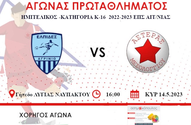 Την Κυριακή 14 Μαϊου 2023, η ομάδα μας θα διεκδικήσει την είσοδο στον τελικό του πρωταθλήματος σε ουδέτερη έδρα- συγκεκριμένα στο γήπεδο Λυγιά Ναυπάκτου- απέναντι στην τυπικά γηπεδούχο ομάδα των Κ16 Ελπίδων Αγρινίου 1, η οποία σημειωτέον τερμάτισε 1η στον Όμιλό της.