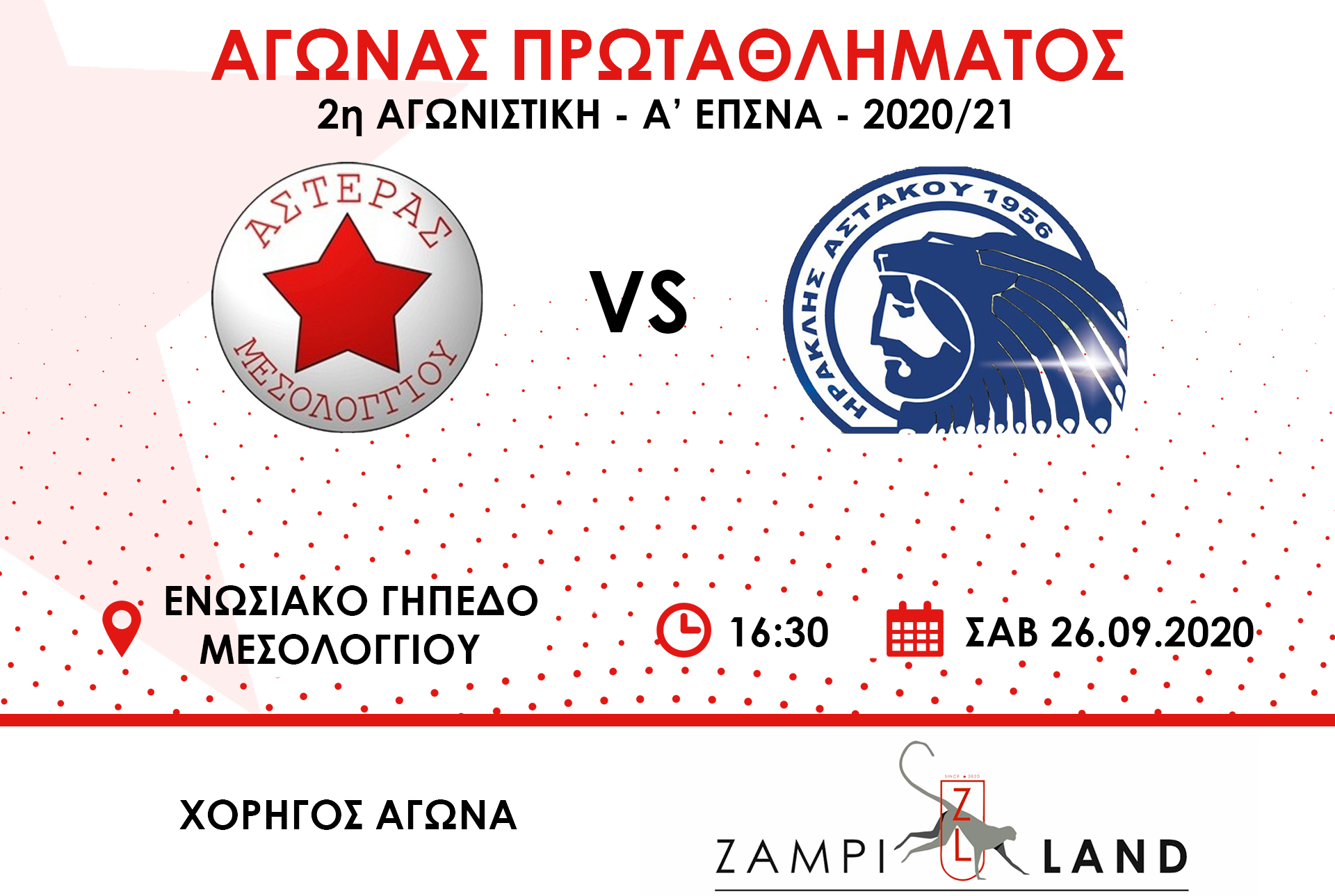 Δεύτερο συνεχές εντός έδρας παιχνίδι για τον Αστέρα Μεσολογγίου που υποδέχεται τον Ηρακλή Αστακού στα πλαίσια της 2ης Αγωνιστικής του πρωταθλήματος της Α’ Κατηγορίας της Ε.Π.Σ. Αιτ/νίας. Ο αγώνας θα διεξαχθεί το Σάββατο 26 Σεπτεμβρίου 2020, το απόγευμα στο Ενωσιακό γήπεδο Μεσολογγίου “Θ. Πασσιόπουλος”.