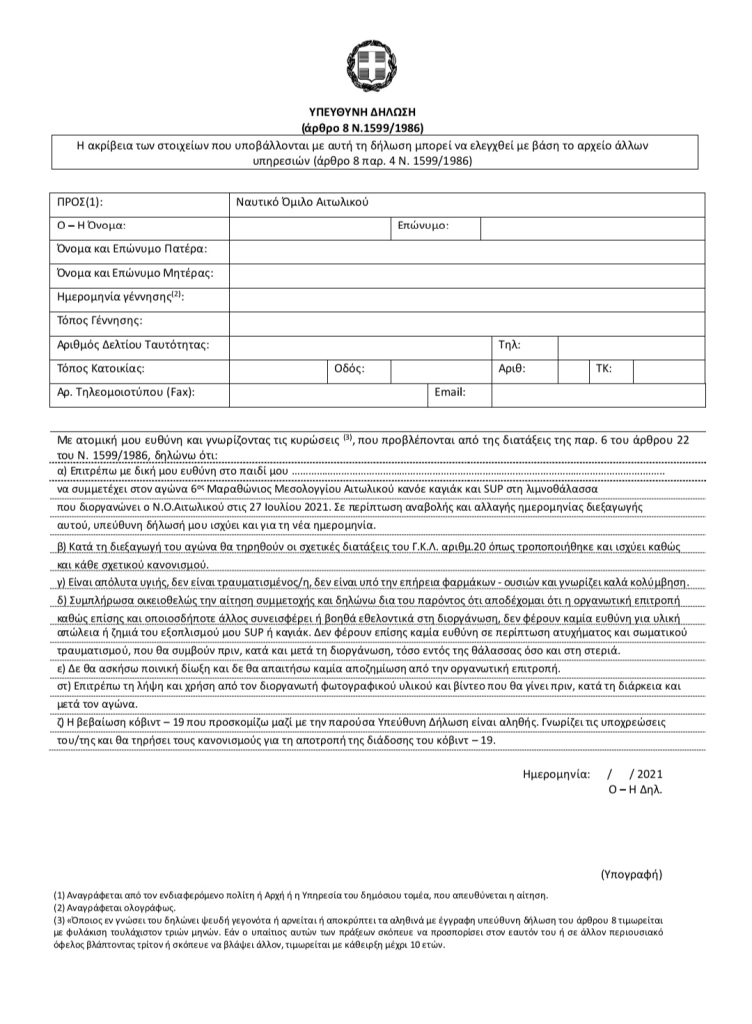 ‐ όσοι δεν έχουν αθλητική ιδιότητα, θα πρέπει να υπογράψουν υπεύθυνη δήλωση ότι είναι υγιείς, γνωρίζουν κολύμβηση και αγωνίζονται με δική τους ευθύνη. (Υπόδειγμα στο Παράρτημα 1 και 2 για γονέα ανηλίκου). Οι υπεύθυνες δηλώσεις είτε θα υπογραφούν μπροστά στη γραμματεία είτε θα διεξαχθούν από το σύστημα gov (Υπεύθυνη Δήλωση) και θα σταλούν ηλεκτρονικά στο Αυτή η διεύθυνση ηλεκτρονικού ταχυδρομείου προστατεύεται από τους αυτοματισμούς αποστολέων ανεπιθύμητων μηνυμάτων. Χρειάζεται να ενεργοποιήσετε τη JavaScript για να μπορέσετε να τη δείτε. μέχρι την Παρασκευή 23 Ιουλίου 2021.