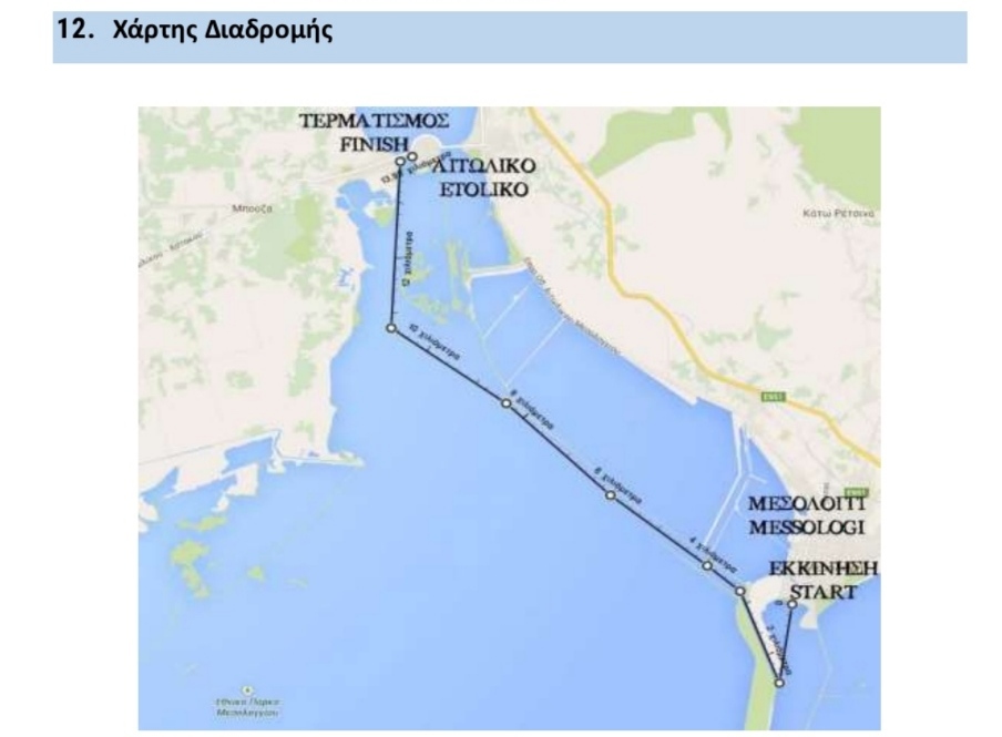 Η διαδρομή των 14χλμ έχει σημείο εκκίνησης το λιμάνι του Μεσολογγίου. Μετά την εκκίνηση οι αγωνιζόμενοι θα κινηθούν νότια προς την αρχή του διαύλου στο λιμάνι του Μεσολογγίου. Έπειτα θα κατευθυνθούν βορειοδυτικά για 2.44χλμ έως το διβάρι διαύλου όπου θα περάσουν από την πόρτα πλάτους 3μ του διβαριού. Η διαδρομή συνεχίζει βορειοδυτικά για 4,33χλμ. Στη συνέχεια η διαδρομή βγαίνει από το δίαυλο και συνεχίζει βορειοδυτικά για 2,8χλμ όπου οι αγωνιζόμενοι μπαίνουν στο δυτικό δίαυλο και συνεχίζουν για 2,6χλμ με κατεύθυνση προς το βορρά έως τον τερματισμό στα δυτικά γεφύρια του Αιτωλικού. Το βάθος σε όλο το μήκος της διαδρομής είναι 0,50-1,00μ. (βλ. άρθρο 12)