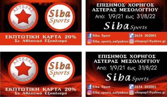 Σε μια σημαντική συμφωνία προχώρησε η Διοίκηση του Αστέρας Μεσολογγίου καθώς για τη φετινή χρονιά 2021-22 θα έχει μεγάλο χορηγό το κατάστημα Αθλητικών ειδών Siba Sport, που εδρεύει στη Ναύπακτο.