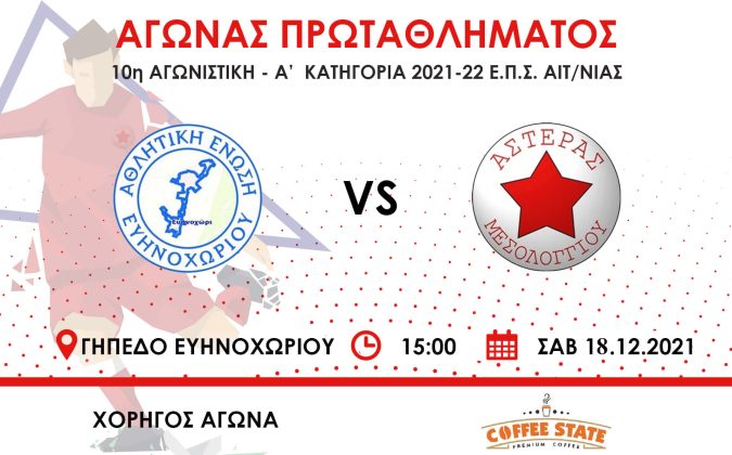Λίγες ώρες αργότερα, στο Ευηνοχώρι φιλοξενείται η ανδρική ομάδα του Αστερία Μεσολογγίου από την τοπική Α.Ε. Ευηνοχωρίου, στον αγώνα για την προτελευταία αγωνιστική του Α’ γύρου του πρωταθλήματος της Α’ Κατηγορίας της Ε.Π.Σ. Αιτωλοακαρνανίας. Ο αγώνας θα ξεκινήσει στις 3:00 μ.μ.  με διαιτητές τους κ. Γκιάφη, Σούζας και Μπάξας.
