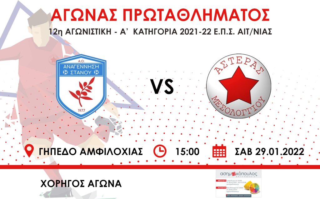 Στην Αμφιλοχία ταξιδεύει ο Αστέρας Μεσολογγίου για να αντιμετωπίσει την πρωτοπόρο του πρωταθλήματος Αναγέννηση Στάνου, το Σάββατο 29 Ιανουαρίου 2022, το μεσημέρι. Ο αγώνας αυτός θα διεξαχθεί για τη 12η Αγωνιστική του πρωταθλήματος της Α’ Κατηγορίας της Ε.Π.Σ. Αιτωλοακαρνανίας, που ανοίγει τη πρεμιέρα του Β’ γύρου.