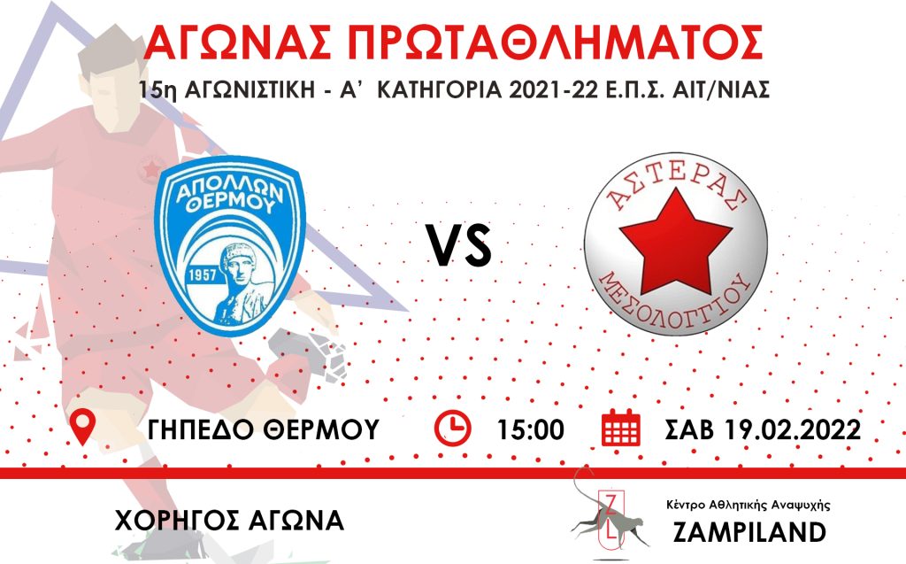 Ο αγώνας για τη 15η Αγωνιστική της Α’ Κατηγορίας του πρωταθλήματος της Ε.Π.Σ. Αιτωλοακαρνανίας μεταξύ του Απόλλων Θέρμου 1957 και του Αστέρα Μεσολογγίου, που είναι να διεξαχθεί το Σάββατο 19 Φεβρουαρίου 2022, το μεσημέρι, αναβάλλεται κατόπιν αιτήματος της ομάδας μας, λόγω αρκετών κρουσμάτων παικτών μας με covid19.