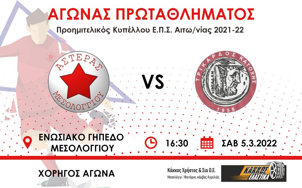 Με συγκρατημένη αισιοδοξία κατεβαίνει ο Αστέρας Μεσολογγίου στον αυριανό προημιτελικό αγώνα Κυπέλλου με αντίπαλο την Ένωση Α.Ο.Κ. Τρίκαρδος, που θα διεξαχθεί το Σάββατο 5 Μαρτίου 2022, στις 4:30 μ.μ. στο Ενωσιακό γήπεδο Μεσολογγίου “Θ. Πασσιόπουλος”.