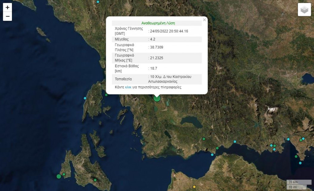 Σεισμική δόνηση μεγέθους 4,2 βαθμών σημειώθηκε στις 23:50 10 χλμ. δυτικά του Καστρακίου Αιτωλοακαρνανίας.