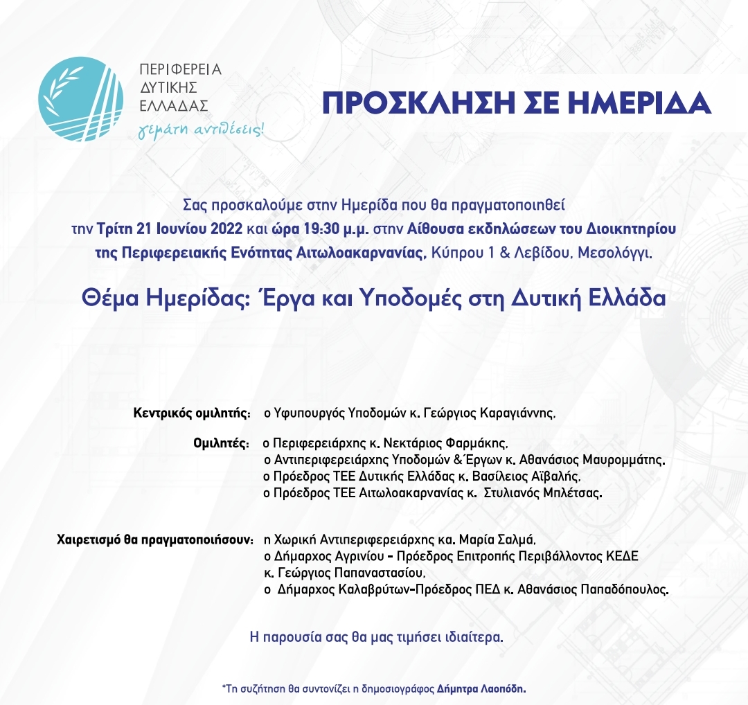 Την Τρίτη 21 Ιουνίου 2022 η Περιφέρεια Δυτικής Ελλάδας πραγματοποιεί Ημερίδα με Θέμα « Έργα και υποδομές στη Δυτική Ελλάδα», στην Αίθουσα Εκδηλώσεων της Π.Ε. Αιτωλοακαρνανίας (Μεσολόγγι – Διοικητήριο).