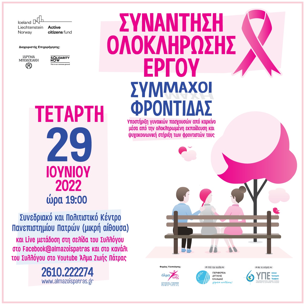 Την Τετάρτη 29 Ιουνίου 2022 και ώρα 19:00, ο Σύλλογος Γυναικών με Καρκίνο Μαστού «ΑΛΜΑ ΖΩΗΣ» Ν. Αχαΐας θα πραγματοποιήσει Συνάντηση Ολοκλήρωσης του Έργου Σύμμαχοι Φροντίδας*- Υποστήριξη γυναικών πασχουσών από καρκίνο μέσα από την ολοκληρωμένη εκπαίδευση και ψυχοκοινωνική στήριξη των φροντιστών τους, στο Συνεδριακό και Πολιτιστικό Κέντρο του Πανεπιστημίου Πατρών(μικρή αίθουσα).
