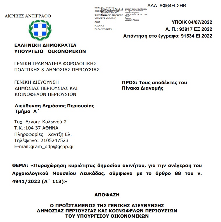 Στην απόφαση αναφέρεται ότι παραχωρείται, άνευ ανταλλάγματος, στο Υπουργείο Πολιτισμού και Αθλητισμού η κυριότητα τμήματος του δημόσιου ακινήτου ιδιοκτησίας ελληνικού Δημοσίου με ΑΒΚ 75 Λευκάδας, εμβαδού 3.812,96 τ.μ., καταγεγραμμένου στο Κτηματολογικό Γραφείο Ιονίων Νήσων, με ΚΑΕΚ 340261615001, κειμένου στο Ο.Τ.479 (ΚΦ), εντός των εγκεκριμένων ορίων του ρυμοτομικού σχεδίου πόλεως του Δήμου Λευκάδας, με αποκλειστικό σκοπό την ανέγερση του Αρχαιολογικού Μουσείου Λευκάδας.