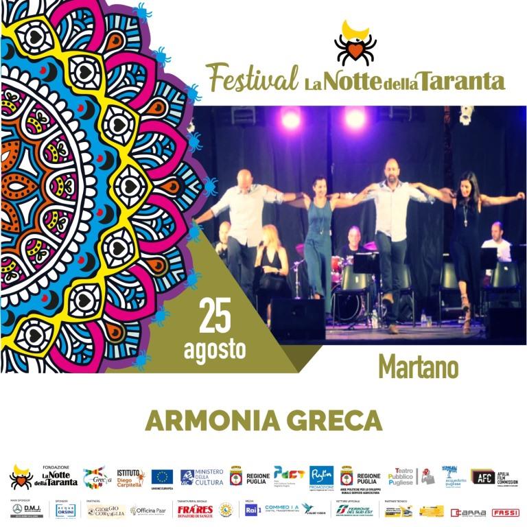 Φέτος, η «La notte della Taranta» συμπληρώνει 25 χρόνια και είναι η δεύτερη φορά που το μουσικό σχήμα «Armonia greca» από την Ι. Π. Μεσολογγίου συμμετέχει με ένα πρόγραμμα ελληνικής και γκρεκάνικης μουσικής. Πρώτη φορά που συμμετείχε ήταν τον Αύγουστο του 2019.