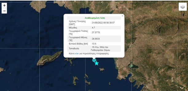 Το επίκεντρο της δόνησης εντοπίζεται στο θαλάσσιο χώρο 14 χλμ. ΝΝΔ της πόλης του Πυθαγορείου Σάμου.