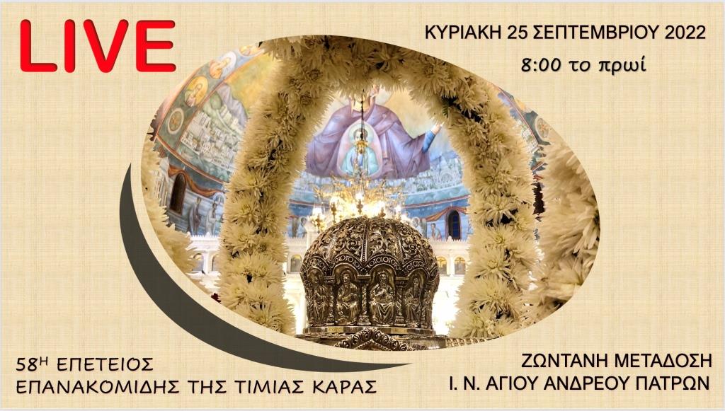 Αύριο, Κυριακή 25 Σεπτεμβρίου 2022, η Αποστολική Εκκλησία των Πατρών, εορτάζει την 58η Επέτειο της Επανακομιδής της Τιμίας Κάρας του Πρωτοκλήτου των Αποστόλων, Ανδρέου, από την Ρώμη στην Πάτρα.