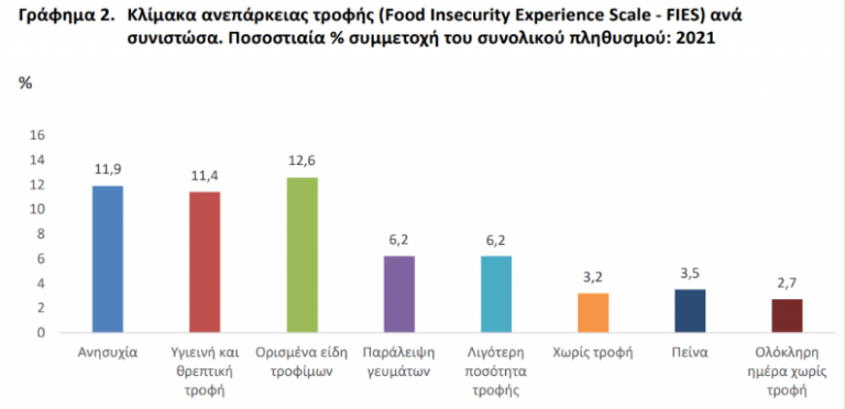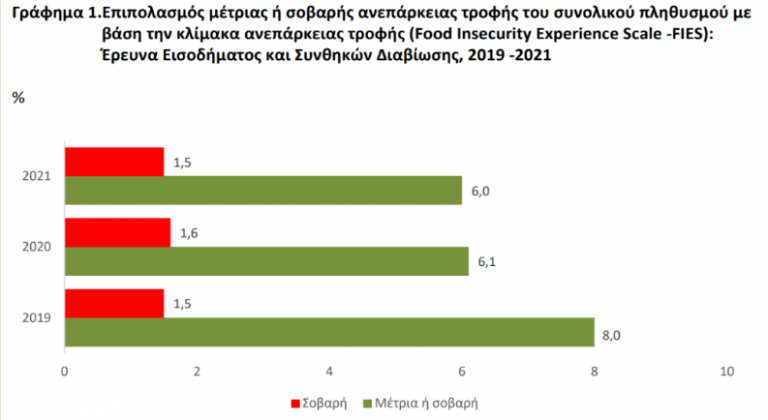 Είναι χαρακτηριστικό ότι κατά την χρονιά που πέρασε το 6% του πληθυσμού δήλωσε ότι αντιμετώπισε μέτρια ή σοβαρή ανεπάρκεια τροφής, ενώ 1,5% ότι αντιμετώπισε μόνο σοβαρή ανεπάρκεια τροφής. Ουσιαστικά, τα συγκεκριμένα στοιχεία αφορούν την περίοδο προ της έναρξης του κυρίως κύματος της ακρίβειας, η οποία πλήττει την Ελλάδα.