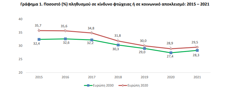 Τα στοιχεία προέρχονται από την Έρευνα Εισοδήματος και Συνθηκών Διαβίωσης των Νοικοκυριών της ΕΛΣΤΑΤ. Το ποσοστό του πληθυσμού σε κίνδυνο φτώχειας ή κοινωνικού αποκλεισμού στην Ελλάδα παραμένει σημαντικά υψηλότερο από τον μέσο όρο της Ευρωζώνης (28,3% με βάση τον αναθεωρημένο ορισμό στην Ελλάδα έναντι 22,0% στην Ευρωζώνη το 2021) και αυξάνεται το 2021 συγκρινόμενο με το 2020 (κατά 0,6 ποσοστιαίες μονάδες, από 28,9% το 2020 σε 29,5% το 2021 με βάση τον παλαιό ορισμό, ή κατά 0,9 ποσοστιαίες μονάδες από 27,4% σε 28,3% με βάση τον νέο ορισμό).
