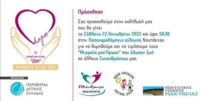 Η εκδήλωση «Το όνομά μου είναι ΖΩΗ» θα πραγματοποιηθεί το Σάββατο 22 Οκτωβρίου 2022, στις 18:30μ.μ. στην Παπαχαραλάμπειο Αίθουσα Ναυπάκτου, ενώ την ερχόμενη Κυριακή 16 Οκτωβρίου 2022, στις 11:30π.μ. στο Λιμάνι Ναυπάκτου «Κωπηλατούμε και θυμόμαστε…» τους μικρούς μας ήρωες που έδωσαν ζωή σε άλλους συνανθρώπους μας.