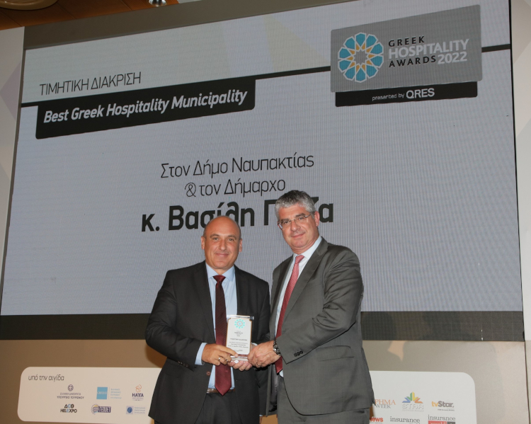 Με το κορυφαίο βραβείο “Best Greek Hospitality Municipality” τιμήθηκε ο Δήμος Ναυπακτίας για το έτος 2022, στο πλαίσιο του καταξιωμένου θεσμού “Greek Hospitality Awards” που πραγματοποιήθηκε υπό την Αιγίδα του Υπουργείου Τουρισμού και του ΕΟΤ. Το τιμητικό βραβείο παρέλαβε ο Δήμαρχος Ναυπακτίας κ.Βασίλης Γκίζας συνοδευόμενος από τον αρμόδιο Αντιδήμαρχο Τουρισμού κ.Ντίνο Τσουκαλά. Στόχος του θεσμού είναι η επιβράβευση των κορυφαίων ξενοδοχειακών και τουριστικών επιχειρήσεων της χώρας με κριτήριο την ποιότητα και το υψηλό επίπεδο των προσφερόμενων υπηρεσιών τους.