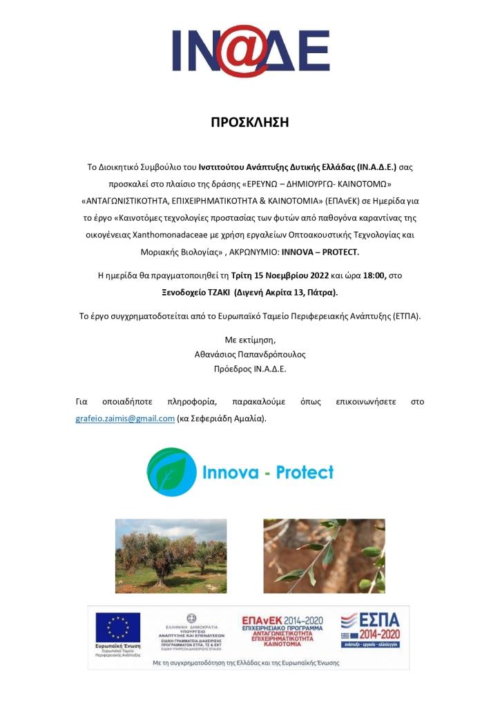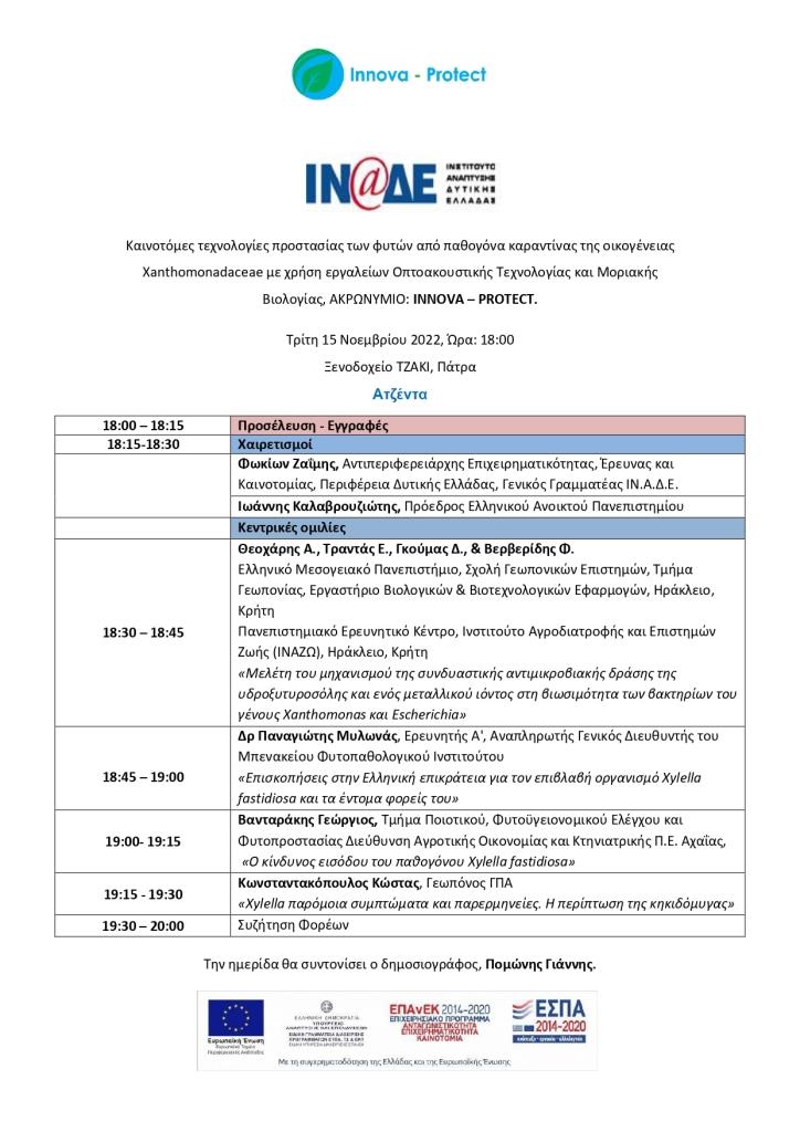 Ημερίδα ενημέρωσης για την ασθένεια της ελιάς διοργανώνει το Ινστιτούτο Ανάπτυξης Δυτικής Ελλάδας (ΙΝ.Α.Δ.Ε.) στο πλαίσιο της δράσης «ΕΡΕΥΝΩ – ΔΗΜΙΟΥΡΓΩ- ΚΑΙΝΟΤΟΜΩ, ΑΝΤΑΓΩΝΙΣΤΙΚΟΤΗΤΑ, ΕΠΙΧΕΙΡΗΜΑΤΙΚΟΤΗΤΑ & ΚΑΙΝΟΤΟΜΙΑ» (ΕΠΑνΕΚ) για το έργο «Καινοτόμες τεχνολογίες προστασίας των φυτών από παθογόνα καραντίνας της οικογένειας Xanthomonadaceae με χρήση εργαλείων Οπτοακουστικής Τεχνολογίας και Μοριακής Βιολογίας» ΑΚΡΩΝΥΜΙΟ: INNOVA – PROTECT. Η ημερίδα θα πραγματοποιηθεί σήμερα Τρίτη 15 Νοεμβρίου 2022 και ώρα 18:00, στο Ξενοδοχείο ΤΖΑΚΙ (Διγενή Ακρίτα 13, Πάτρα)