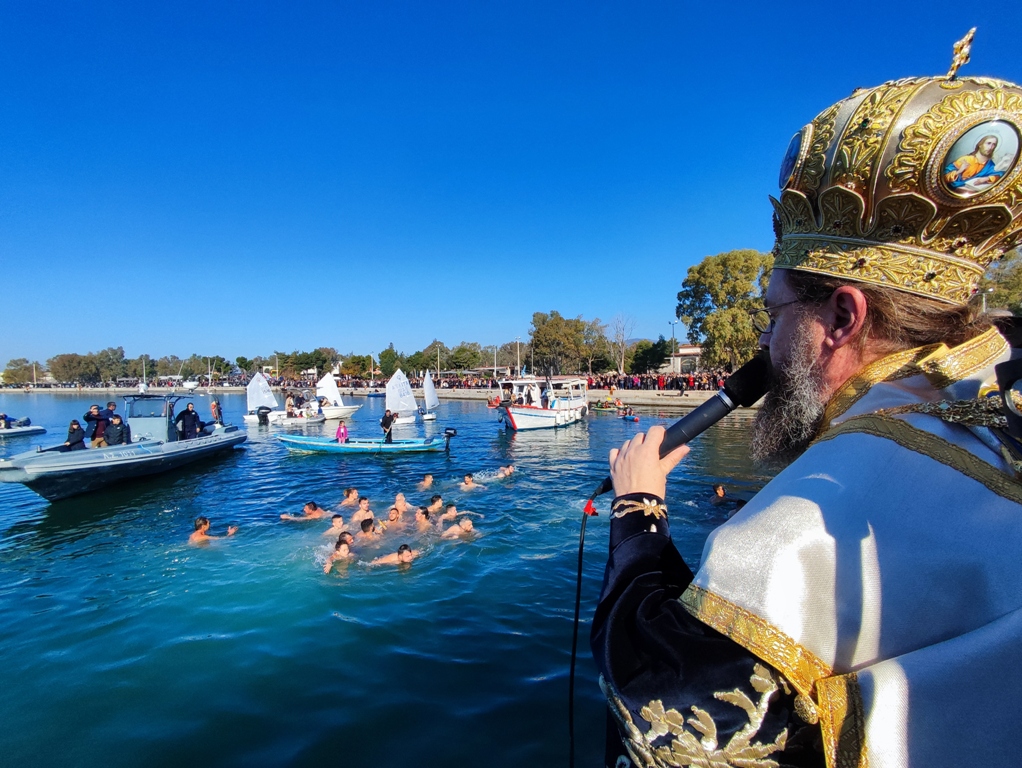 Αμέσως μετά τη Θεία Λειτουργία ο Σεβασμιώτατος τέλεσε την Ακολουθία του Μεγάλου Αγιασμού εντός του Ναού και στη συνέχεια, με λιτανευτική πομπή, άπαντες κατευθύνθηκαν στο Λιμάνι της Ιεράς Πόλεως, όπου πραγματοποιήθηκε η Τελετή Κατάδυσης του Τιμίου Σταυρού και ο Αγιασμός των Υδάτων. Πολλοί νέοι βούτηξαν στα κρύα νερά για να ανασύρουν τον Τίμιο Σταυρό. Ο πρώτος έλαβε από τον Σεβασμιώτατο, ως ευλογία, έναν χρυσό σταυρό και οι υπόλοιποι αναμνηστικό δώρο.
