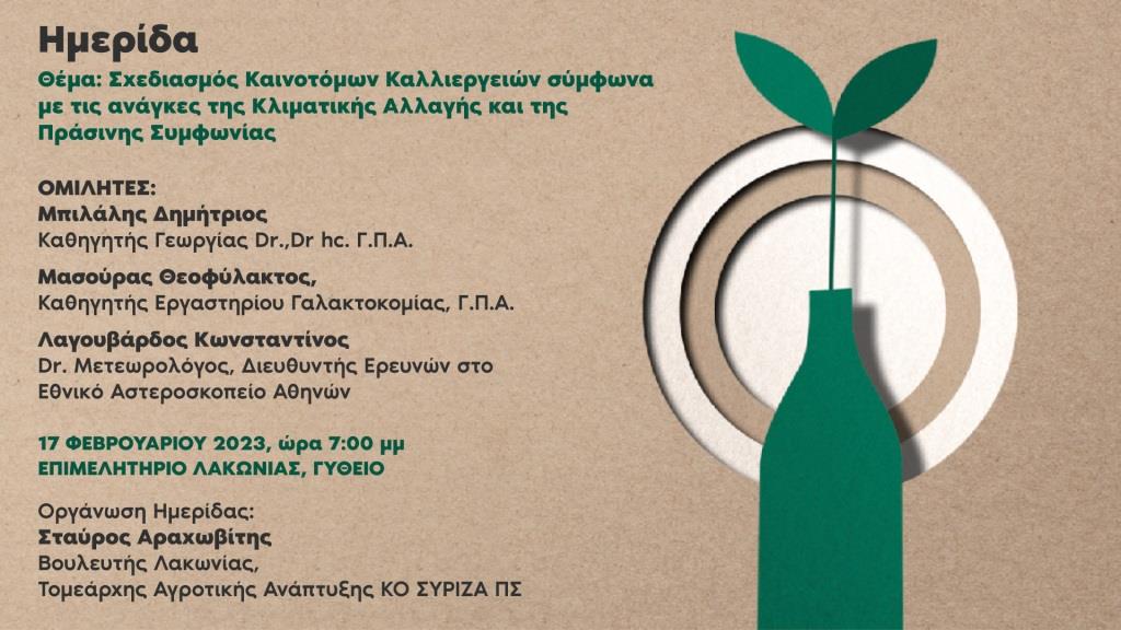 Εκδήλωση με θέμα: «Σχεδιασμός καινοτόμων καλλιεργειών σύμφωνα με τις ανάγκες της κλιματικής αλλαγής και της πράσινης συμφωνίας» που θα πραγματοποιηθεί στο Γύθειο στην αίθουσα του Επιμελητηρίου την Παρασκευή 17 Φεβρουαρίου 2023 και ώρα 7:00 μ.μ.