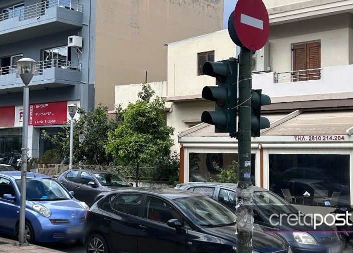 Το φανάρι που είναι στραμμένο στο πεζοδρόμιο, βρίσκεται σε κεντρικό δρόμο του Ηρακλείου