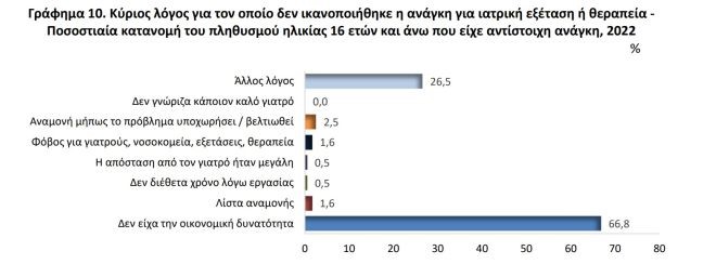 Από αυτούς, το 24,3% δεν την έλαβε κάθε φορά που τη χρειάστηκε. Εκτός από το 68% αυτών που δεν είχαν την οικονομική δυνατότητα, το 2,5% έκανε υπομονή μήπως και υποχωρήσει το πρόβλημα υγείας που αντιμετώπιζε και το 1,6% δεν πήγε στον γιατρό λόγω της μεγάλης λίστας αναμονής.