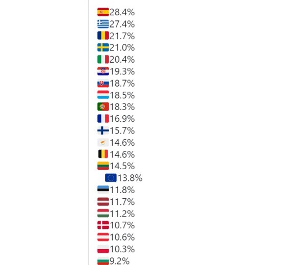 Σύμφωνα με τα στοιχεία της Κομισιόν, το σχετικό ποσοστό στη χώρα κυμαίνεται στο 27,4%, "επίδοση" που την κατατάσσει δεύτερη στη σχετική λίστα στην Ευρώπη των 27 μετά την Ισπανία που είναι πρώτη με 28,4%.