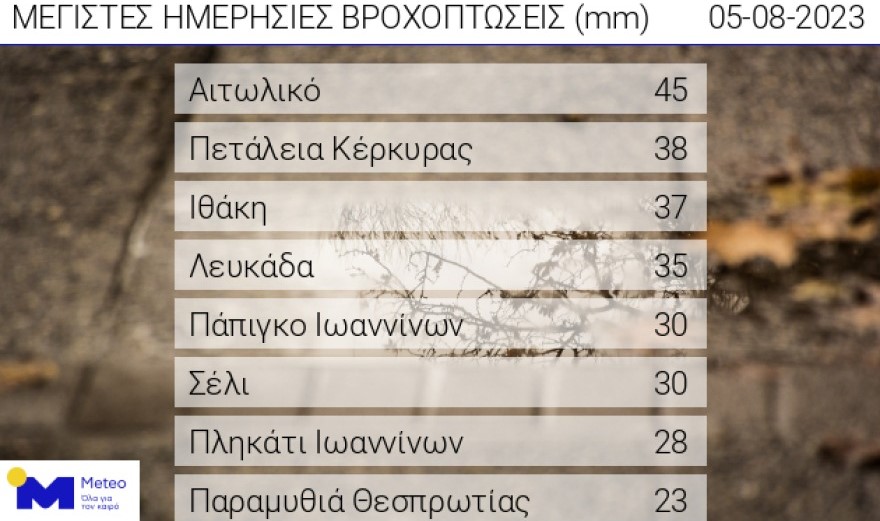 Στον αντίποδα, τα υψηλότερα ύψη βροχής, σύμφωνα και πάλι με τον χάρτη του meteo, καταγράφηκαν σε Αιτωλικό, Πετάλεια Κέρκυρας, Ιθάκη, Λευκάδα, Πάπιγκο Ιωαννίνων, Σέλι, Πληκάτι Ιωαννίνων και Παραμυθιά Θεσπρωτίας.