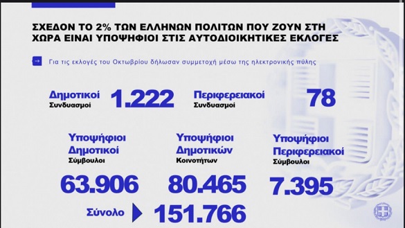 Και αν κάποιος αναρωτιέται «μα πόσοι κατεβαίνουν στις εκλογές», η απάντηση βρίσκεται στα στοιχεία του υπουργείου Εσωτερικών και δείχνουν ότι περισσότεροι από 151 χιλιάδες πολίτες θα δώσουν την «μάχη» του σταυρού στις αυτοδιοικητικές εκλογές του Οκτωβρίου. Περίπου δηλαδή το 2% των Ελλήνων πολιτών είναι υποψήφιοι.