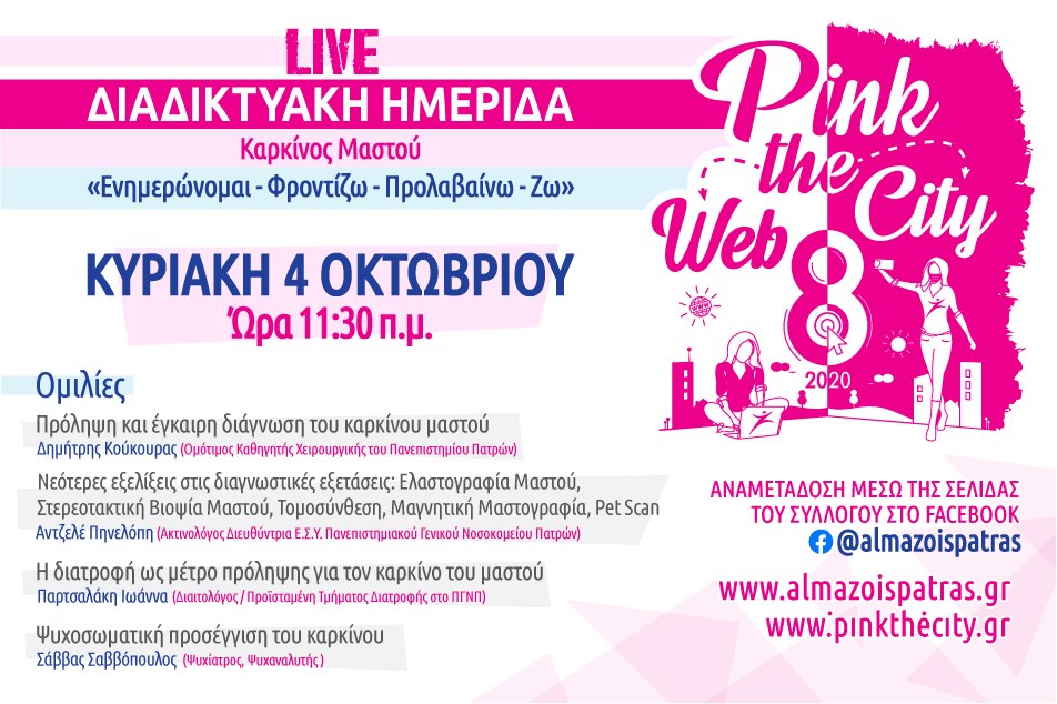 Το Pink the City 2020 ξεκινά δυναμικά. Σήμερα, 1 Οκτωβρίου, άνοιξε, στην πλατεία Γεωργίου, το περίπτερο εγγραφών στη φετινή εναλλακτική δράση που έχει γίνει θεσμός για την πόλη, από το Σύλλογο Γυναικών με καρκίνο μαστού – «ΑΛΜΑ ΖΩΗΣ» Ν. Αχαΐας, ενώ από την Κυριακή 4 Οκτωβρίου ξεκινούν οι διαδικτυακές εκδηλώσεις και δράσεις, στο πλαίσιο του Pink the city… pink the web 2020, με την ζωντανή μετάδοση ημερίδας του Συλλόγου σχετικά με την πρόληψη και έγκαιρη διάγνωση του καρκίνου του μαστού.