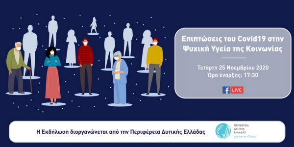 Διαδικτυακή ημερίδα με θέμα «Επιπτώσεις του Covid19 στην Ψυχική Υγεία της Κοινωνίας» πραγματοποιεί η Περιφέρεια Δυτικής Ελλάδας, την Τετάρτη 25 Νοεμβρίου 2020 και ώρα 17:30.