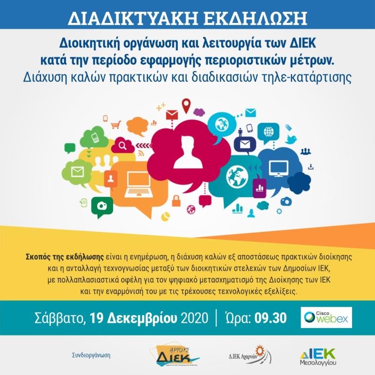 Mε σκοπό την ενημέρωση, τη διάχυση καλών εξ αποστάσεως πρακτικών διοίκησης και την ανταλλαγή τεχνογνωσίας μεταξύ των διοικητικών στελεχών των Δημοσίων ΙΕΚ, με πολλαπλασιαστικά οφέλη για τον ψηφιακό μετασχηματισμό της Διοίκησης των ΙΕΚ και την εναρμόνισή του με τις τρέχουσες τεχνολογικές εξελίξεις.