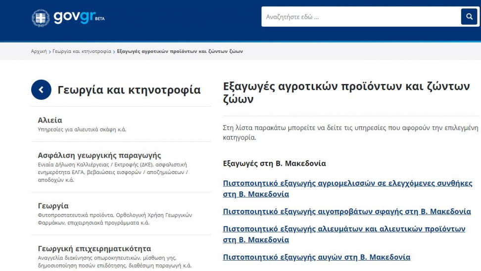 Η πλατφόρμα περιλαμβάνει 120 διακριτές αιτήσεις για έκδοση πιστοποιητικών εξαγωγών σε τριάντα χώρες, οι οποίες είναι διαθέσιμες στο gov.gr, στην κατηγορία «Γεωργία και κτηνοτροφία» και την υποκατηγορία «Εξαγωγές αγροτικών προϊόντων και ζώντων ζώων». Επιτυγχάνεται, έτσι, ουσιαστικά η ψηφιοποίηση του συνόλου του εξαγωγικού εμπορίου ζώντων ζώων, προϊόντων ζωικής προέλευσης και ζωικών υποπροϊόντων προς τρίτες χώρες.