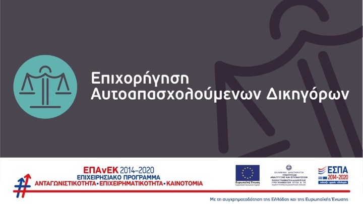 Η νέα δράση «Επιχορήγηση Αυτοαπασχολούμενων Δικηγόρων» αφορά στην ενίσχυση με τη μορφή της επιχορήγησης των αυτοαπασχολούμενων δικηγόρων που επλήγησαν από την πανδημία COVID-19 λόγω της μη φυσικής λειτουργίας των δικαστηρίων.