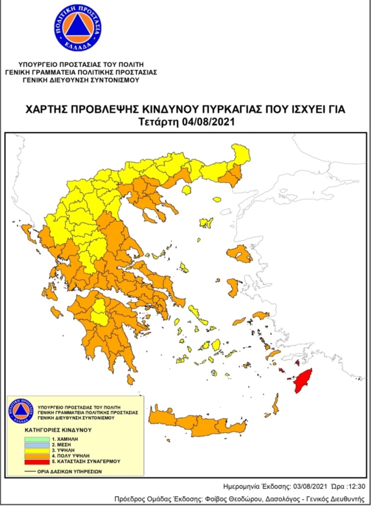 Πολύ υψηλό κίνδυνο πυρκαγιάς (κατηγορία κινδύνου 4) σε όλη τη Δυτική Ελλάδα προβλέπει η Γενική Γραμματεία Πολιτικής Προστασίας και για την Τετάρτη 4 Αυγούστου 2021, σύμφωνα με τον επισυναπτόμενο ημερήσιο Χάρτη Πρόβλεψης Κινδύνου Πυρκαγιάς.