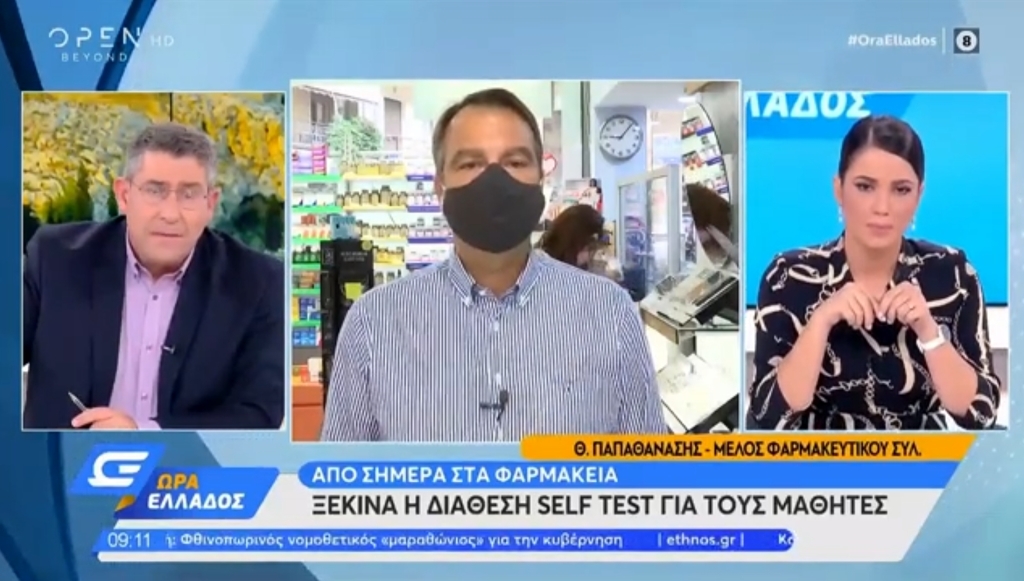 Στην εκπομπή του OPEN TV «Ώρα Ελλάδος» με τους δημοσιογράφους Ακη Παυλόπουλο και Ευλαμπία Ρέβη παραβρέθηκε ο Θανάσης Παπαθανάσης Πρόεδρος του Φαρμακευτικού Συλλόγου Αιτωλοακαρνανίας και μέλος του ΔΣ του Πανελλήνιου Φαρμακευτικού Συλλόγου όπου και δήλωσε «Από σήμερα ξεκινά η δωρεάν διάθεση self tests για τους μαθητές».