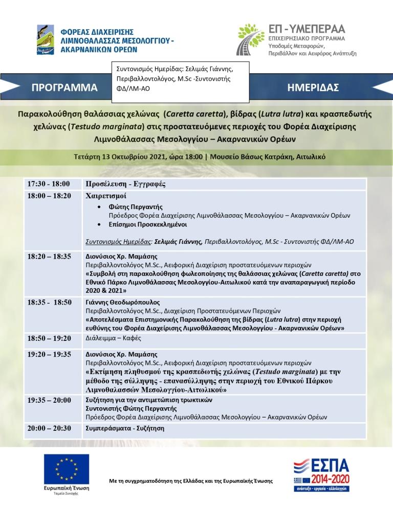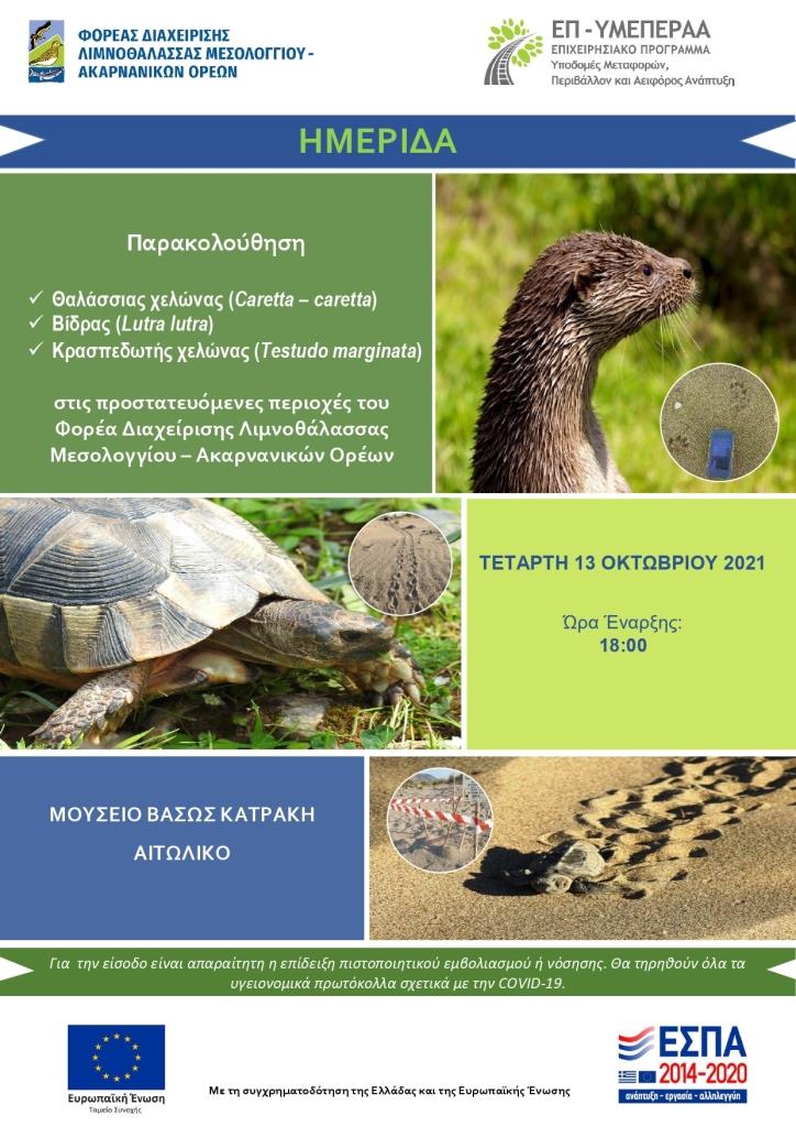 O Φορέας Διαχείρισης Λιμνοθάλασσας Μεσολογγίου-Ακαρνανικών Ορέων, διοργανώνει Ημερίδα με θέμα «Παρακολούθηση θαλάσσιας χελώνας (Caretta-Caretta), βίδρας (Lutra lutra), κρασπεδωτής χελώνας (Testudo marginata) στις προστατευόμενες περιοχές του Φορέα Διαχείρισης Λιμνοθάλασσας Μεσολογγίου - Ακαρνανικών Όρεων», η οποία θα πραγματοποιηθεί την Τετάρτη, 13 Οκτωβρίου 2021 και ώρα 18:00 μ.μ. στο Μουσείο Βάσως Κατράκη, στο Αιτωλικό.
