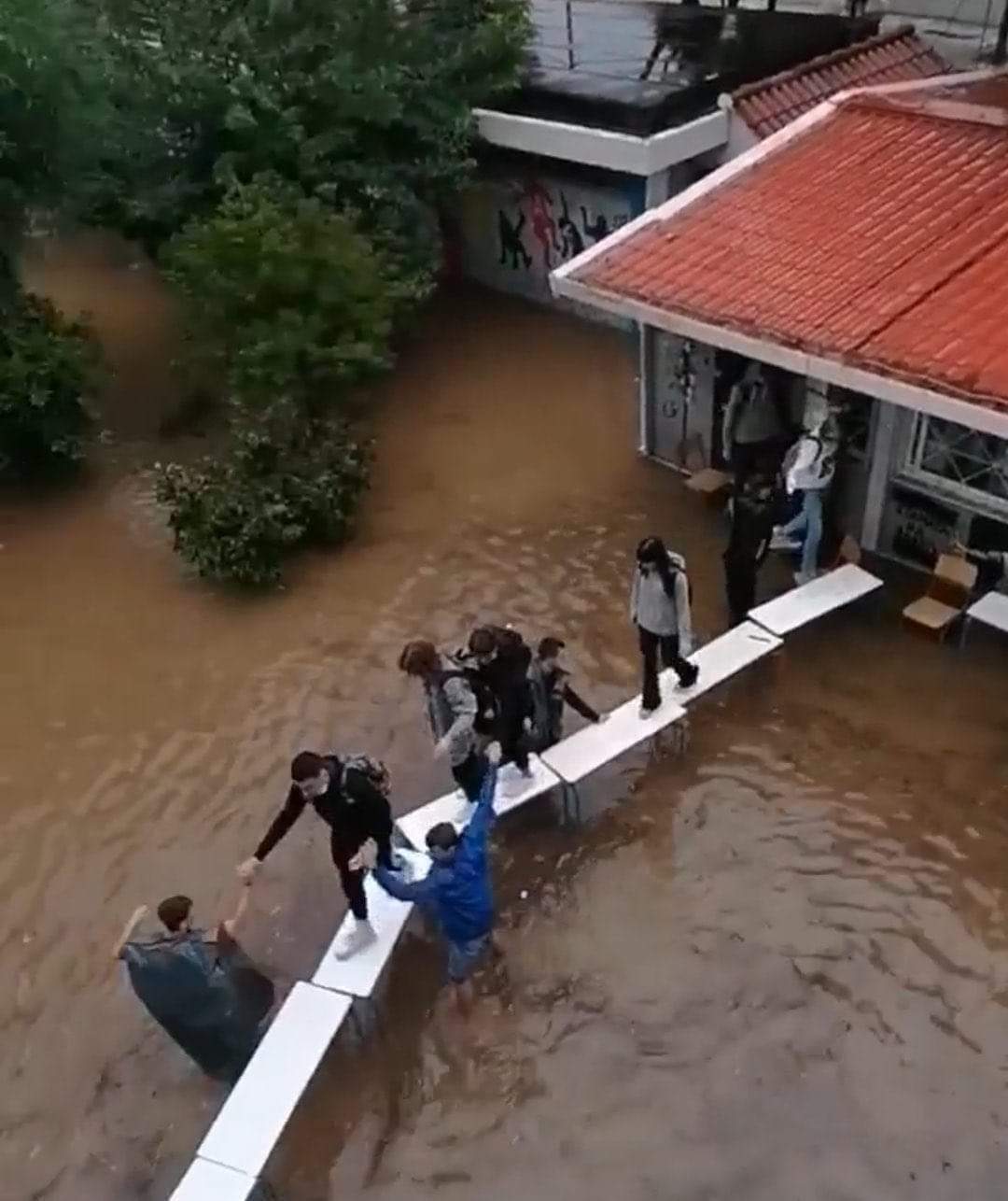 Από εχθές το πρωί η μετεωρολογική υπηρεσία αλλά και η γενική γραμματεία πολιτικής προστασίας μέχρι αργά το βράδυ ενημέρωνε για την επικείμενη κακοκαιρία που θα έπληττε την χώρα μας. Κάποιοι προέβησαν σε κλεισίματα των σχολείων προληπτικά προς αποφυγήν δυσάρεστων καταστάσεων. Κάποιοι άλλοι δεν ακολούθησαν τις οδηγίες. Ούτε αυτές με ούτε και τις γενικές οδηγίες με αποτέλεσμα μαθητές σε σχολείο της Nέας Φιλαδέλφειας για να βγουν από την σχολική αίθουσα να φτιάξουν γέφυρα με τα θρανία.