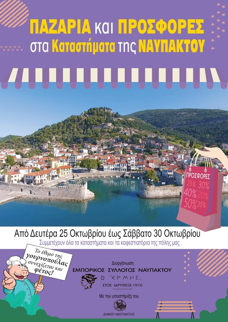 Aπό Δευτέρα 25 έως Σάββατο 30 Οκτωβρίου ο Εμπορικός Σύλλογος Αγρινίου, καλεί όλο τον κόσμο να βγει να ψωνίσει με Εκπτώσεις και Προσφορές στα καταστήματα της Ναυπάκτου!!!