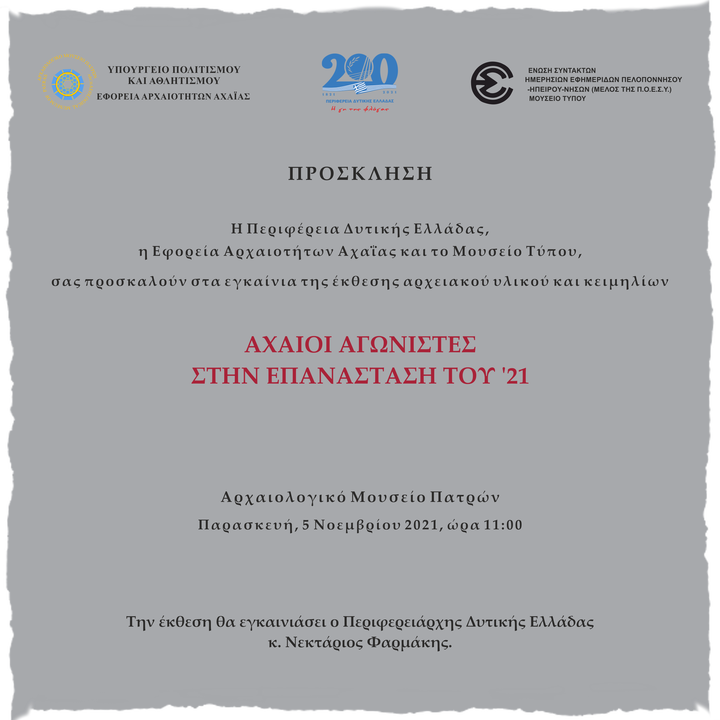 Η Περιφέρεια Δυτικής Ελλάδας, η Εφορεία Αρχαιοτήτων Αχαΐας και το Μουσείο Τύπου της Ένωσης Συντακτών Ημερησίων Εφημερίδων Πελοποννήσου, Ηπείρου και Νήσων (ΕΣΗΕΠΗΝ) διοργανώνουν έκθεση με τίτλο «Αχαιοί αγωνιστές στην Επανάσταση του ‘21».