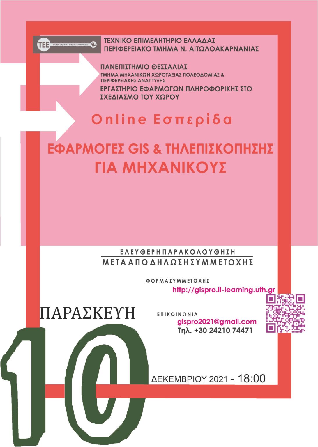 Η παρακολούθηση είναι ελεύθερη μετά από δήλωση συμμετοχής στον ιστότοπο: http://gispro.ll-learning.uth.gr/