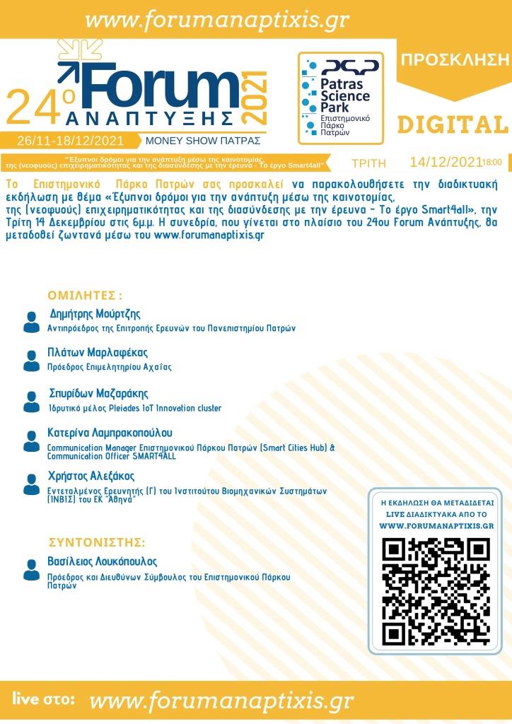 Την Τρίτη 14 Δεκεμβρίου 2021, στις 18:00, το Επιστημονικό Πάρκο Πατρών θα βρίσκεται στο 24ο Forum Ανάπτυξης, στη διαδικτυακή εκδήλωση "Έξυπνοι δρόμοι για την ανάπτυξη μέσω της καινοτομίας, της (νεοφυούς) επιχειρηματικότητας και της διασύνδεσης με την έρευνα - Το έργο Smart4all", που διοργανώνει το ΕΠΠ στο πλαίσιο του 24ου Forum Ανάπτυξης.