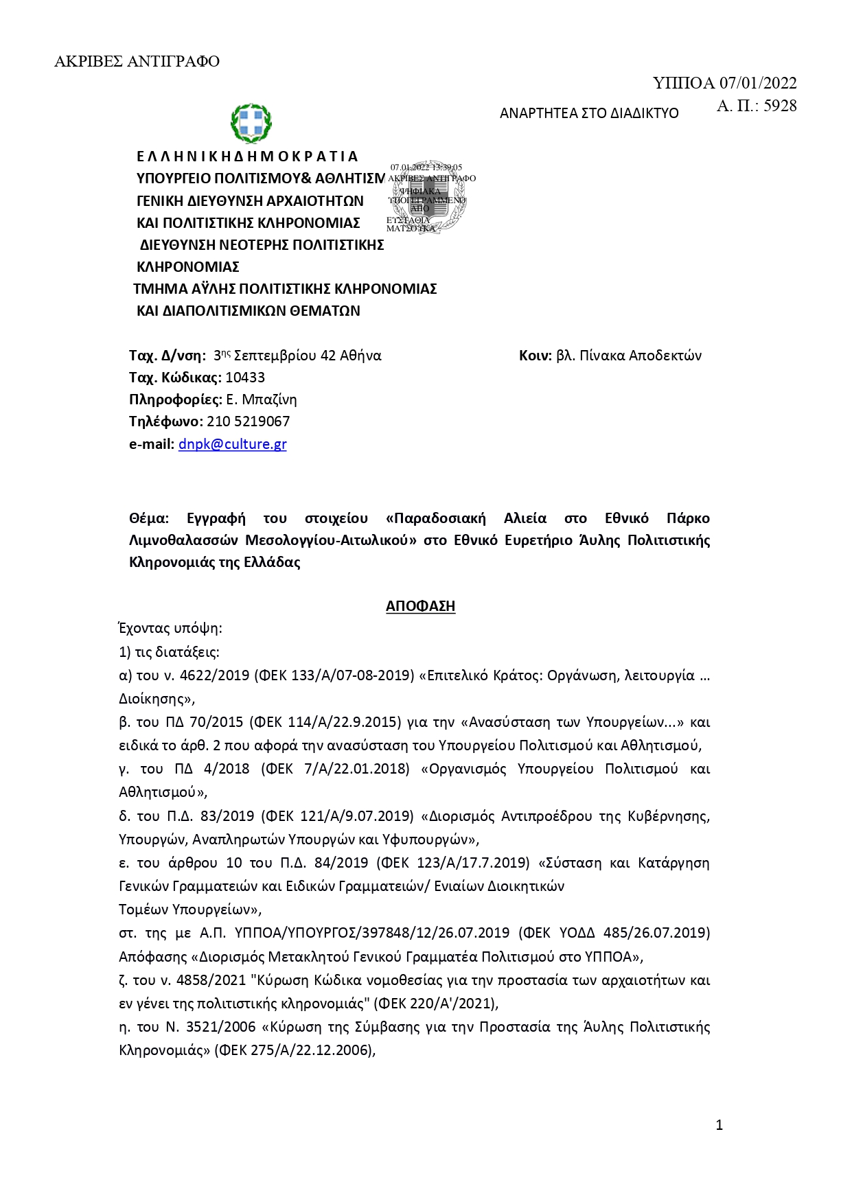 Με απόφαση της Υπουργού Πολιτισμού & Αθλητισμού κ. Λίνας Μενδώνη στις 7/1/2022 και μετά από τέσσερα χρόνια προσπαθειών του Φορέα Διαχείρισης Λιμνοθάλασσας Μεσολογγίου - Ακαρνανικών Ορέων εντάχθηκε στο Εθνικό Ευρετήριο Άυλης Πολιτιστικής Κληρονομιάς της Ελλάδας η «Παραδοσιακή Αλιεία στο Εθνικό Πάρκο Λιμνοθαλασσών Μεσολογγίου-Αιτωλικού»