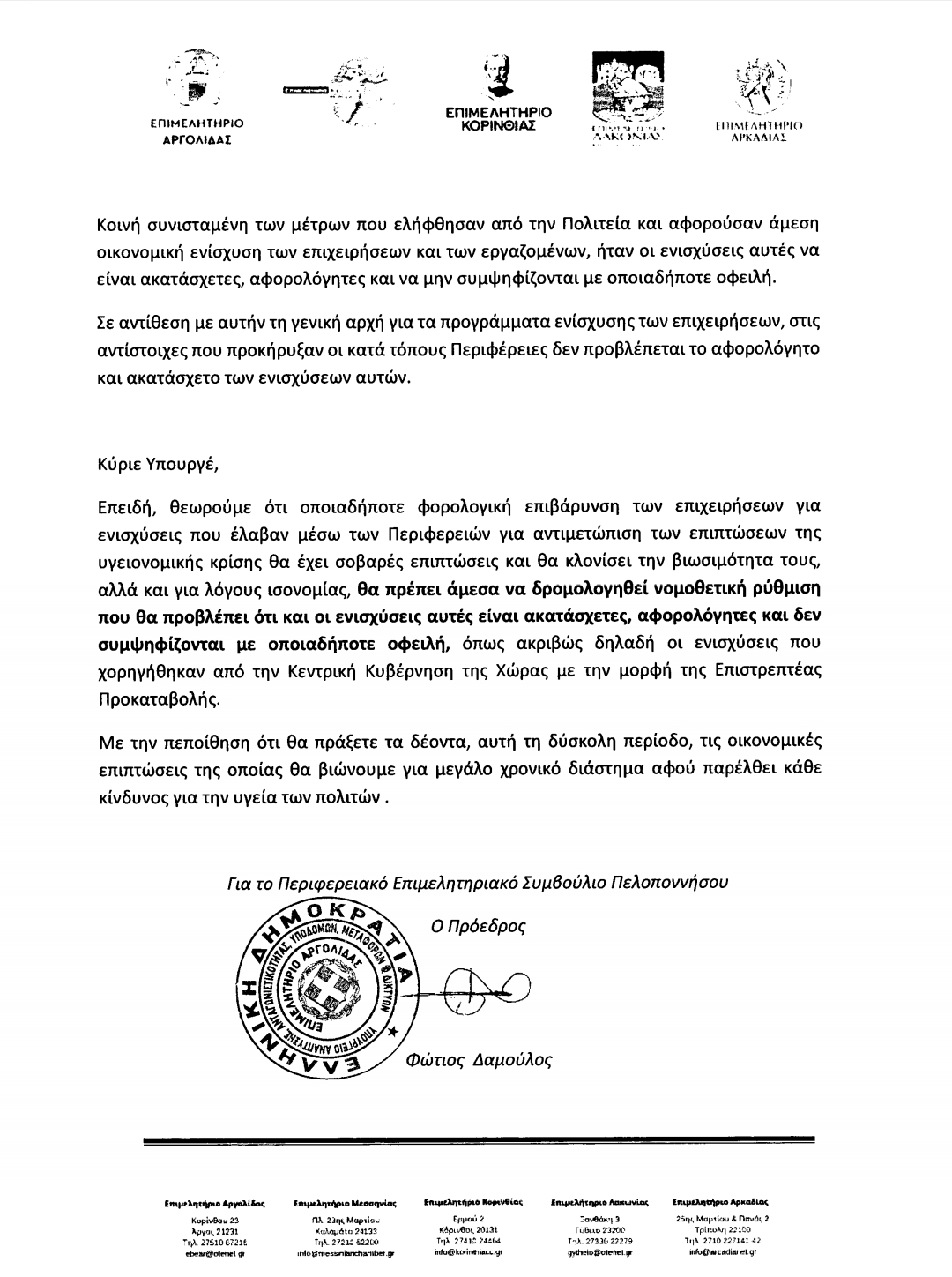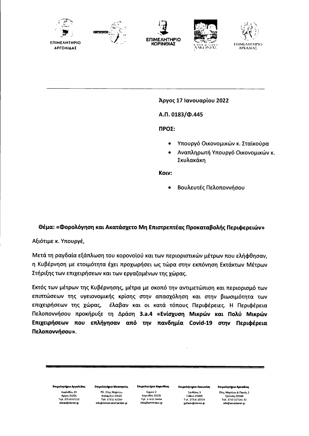 Οι βουλευτές Σταύρος Αραχωβίτης και Αλέξανδρος (Αλέξης) Χαρίτσης καταθέτουν προς τους κ.κ Υπουργούς Οικονομικών και Ανάπτυξης & Επενδύσεων αναφορά την επιστολή διαμαρτυρίας των Επιμελητηρίων Λακωνίας, Αργολίδος, Κορινθίας, Αρκαδίας και Μεσσηνίας προς τον Υπουργό και Αν. Υπουργό Οικονομικών κ.κ. Σταϊκούρα και Σκυλακάκη, όπου επισημαίνεται η ανάγκη για άμεση νομοθετική ρύθμιση που θα προβλέπει ότι οι οικονομικές ενισχύσεις που έλαβαν οι επιχειρήσεις μέσω των Περιφερειών για την αντιμετώπιση των επιπτώσεων της πανδημίας, θα πρέπει να είναι ακατάσχετες, αφορολόγητες και να μην συμψηφίζονται με οποιαδήποτε άλλη οφειλή.