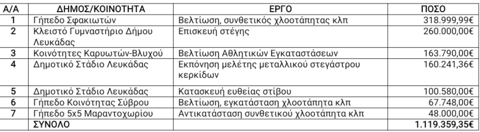 1.120.000 ευρώ δεσμεύθηκαν και σύντομα θα διατεθούν από το Υπουργείο Εσωτερικών για τη βελτίωση αθλητικών εγκαταστάσεων στο νησί μας, σε 7 έργα για τη νεολαία μας, για τους ανθρώπους και τους συλλόγους που καλλιεργούν τον αθλητισμό.