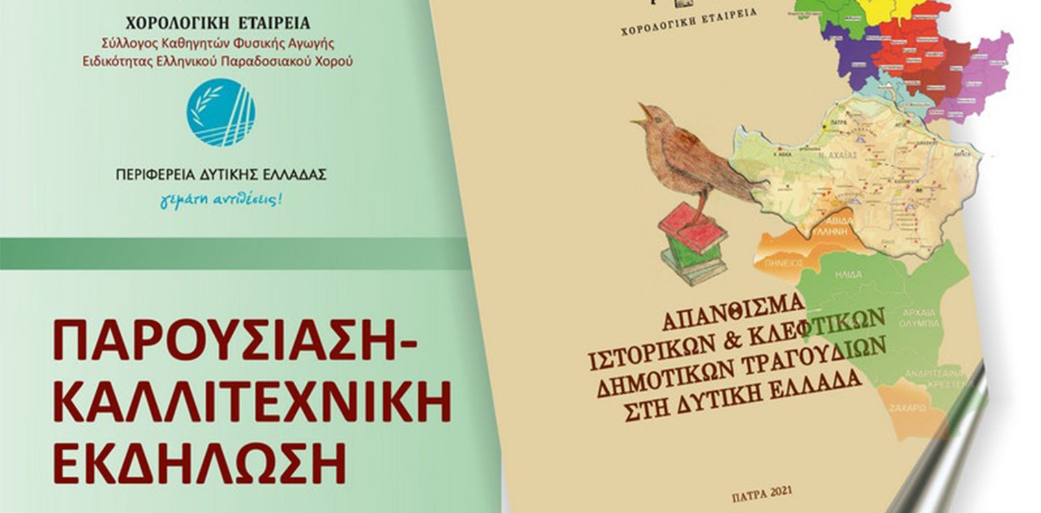 «Απάνθισμα Ιστορικών και Κλέφτικων Δημοτικών Τραγουδιών στη Δυτική Ελλάδα» είναι ο τίτλος του βιβλίου που εξέδωσε η Χορολογική Εταιρεία με την υποστήριξη της Περιφέρειας Δυτικής Ελλάδας. Η επετειακή έκδοση που συνδέεται με τη συμπλήρωση 200 ετών από την Ελληνική Επανάσταση θα παρουσιαστεί σε εκδήλωση που θα πραγματοποιηθεί την Τετάρτη 9 Μαρτίου 2022 και ώρα 7:30 μμ., στο Δημοτικό Θέατρο «Απόλλων» της Πάτρας.