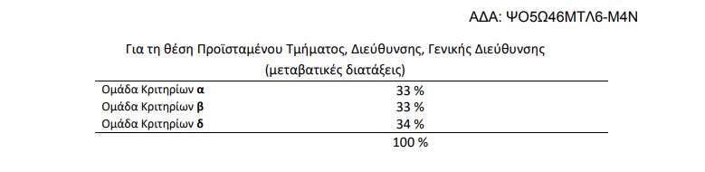 - Υπάλληλος που έχει διατελέσει προϊστάμενος Τμήματος κατόπιν διαδικασίας επιλογής για 48 μήνες και προϊστάμενος Διεύθυνσης για 24 μήνες κατόπιν αναπλήρωσης θα μοριοδοτηθεί ως εξής:
