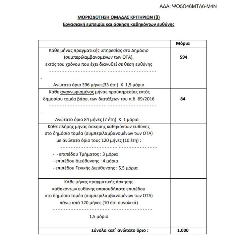 - Σε περίπτωση που στο πρόσωπο του υποψηφίου συντρέχουν όλες οι περιπτώσεις άσκησης καθηκόντων ευθύνης στο δημόσιο τομέα (συμπεριλαμβανομένων των ΟΤΑ), λαμβάνονται καταρχάς υπόψη τα μόρια άσκησης καθηκόντων ευθύνης επιπέδου Γενικής Διεύθυνσης, ακολούθως τα μόρια άσκησης καθηκόντων ευθύνης επιπέδου Διεύθυνσης και τέλος τα μόρια άσκησης καθηκόντων ευθύνης επιπέδου Τμήματος, μέχρι τη συμπλήρωση του ανώτατου αριθμού των 120 μηνών.