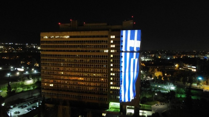 Μια τεράστια γαλανόλευκη σημαία, φωτίζει από χτες το βράδυ ολόκληρο το 15ώροφο κτίριο του υπουργείου Προστασίας του Πολίτη στην Λεωφ. Κατεχάκη, σε ένδειξη τιμής για την επέτειο της Επανάστασης του 1821 και τη μνήμη των ηρώων που αγωνίστηκαν για την ελευθερία.